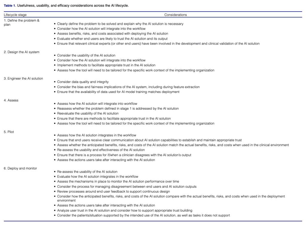 End users trust of AI is a multifaceted, important consideration across the development lifecycle. Trust affects end user reliance on systems, especially in complex settings with incomplete information. AI should be designed to support appropriate trust, meaning trust depends on the context of use and the AI’s purpose, process, and performance in that specific context and how the human might team with the AI model. The interface design and broader system architecture can support or hinder appropriate trust by end-users. Healthcare delivery organizations should also build trust in these solutions with their patient population. The impact of AI technology in the patients’ healthcare journey must be incorporated into the usefulness assessment. If not, harm to the patient could occur in the form of financial toxicity or other adverse outcomes. While some research has provided methods to inform the design of AI for appropriate trust, more work is needed in this area. Designers can communicate AI capabilities or limitations to end users through methods such as model fact labels, performance indicators, or system transparency elements. These are particularly beneficial when the AI solution employed relies on less interpretable “black-box’ methodology. Monitoring and incorporating end-user feedback into the design of AI can also enhance trust. Lastly, developing clinician and other end user competencies in AI can increase engagement among clinician stakeholders and enable appropriate trust.